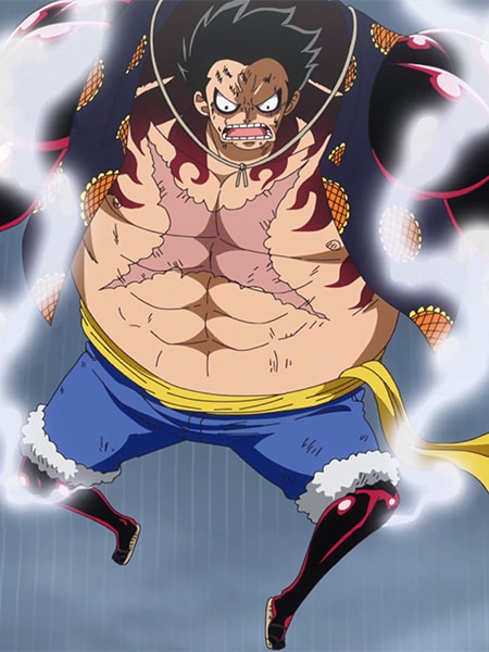 Luffy è mostrato qui mentre usa questa tecnica. È circondato da una specie di fumo bianco e sembra levitare sopra la terra. Possiamo vedere che tutto il suo corpo è gonfiato con il suo torso che diventa molto grande, il suo solito gilet non lo copre affatto. Come succede sempre quando usa questa tecnica, le sue membra diventano di un rosso molto scuro e non riesce più ad entrare nelle sue scarpe. Infine, all’altezza della testa, anche i suoi muscoli sono gonfiati, il che gli dà un aspetto particolarmente cattivo.